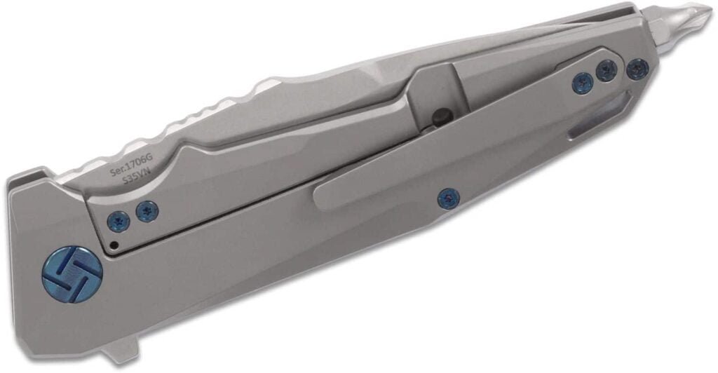 Artisan Preditor Frame Lock S35VN 1706G-GY Titanium Specifications Blade Length: 3.75″ Cutting Edge: 3.35″ Closed Length: 5.5″ Overall Length: 9.25″ Blade Material: S35VN Stainless Steel Blade Thickness: 0.15″ Blade Hardness: 58-60HRC Blade Style: Drop Point Blade Finish: Stonewashed Handle Material: TC4 Titanium Handle Thickness: 0.48″ Locking Mechanism: Frame Lock Pivot Assembly: Ceramic Bearings Pocket Clip: Tip-Up, Right/Left Carry Weight: 5.4 oz.