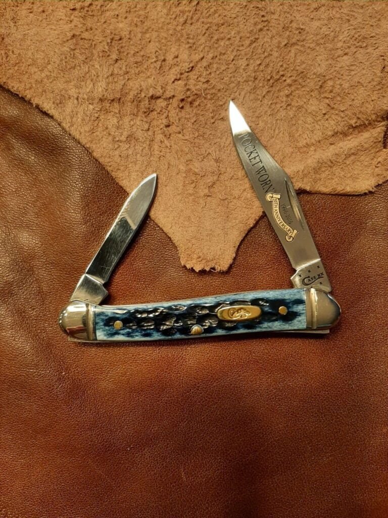 Case 62109 x SS Mini Copperhead Pocket Warn Denim Bone· Handle Material: Blue Bone· Bolster Material: Nickle· Blade Material: SS. Weight: 1.6 oz· New in BoxThe knife Pictured is the actual knife you will receive