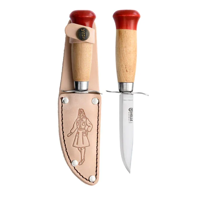 Helle can trace the origin of these knives back to 1947, when we made the first scout knife with a red butt. The current designs with the girl and boy scout and their traditional scout outfits dates back to 1971.