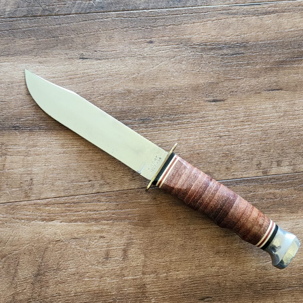 Vintage KABAR 1207 USA Hunting Knife with Leather Sheath. 5.75″ inch blade. Used condition. Nice sturdy knife, ready for the hunt. Handle and blade are tight and straight, No wiggle. Some scratches on pommel. Some light surface rust pitting on blade
