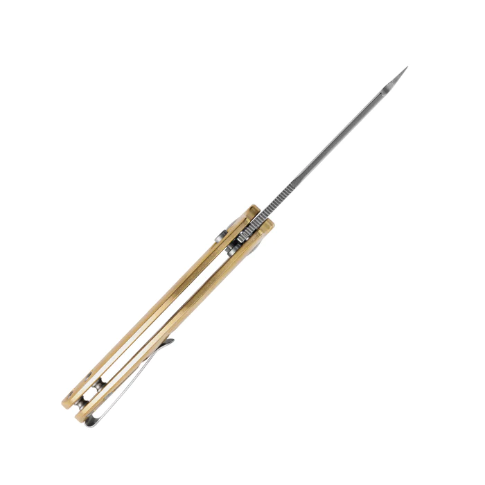 The handle, crafted from brass, showcases a captivating metallic yellow hue when illuminated, exuding a unique and irresistible charm. Its substantial texture ensures a secure grip during use, instilling confidence in every hold. The clip is conveniently adjustable, catering to the needs of left-handed individuals and enhancing overall user-friendliness. With its robust 3V blade, this knife boasts outstanding durability and impressive sharpness.