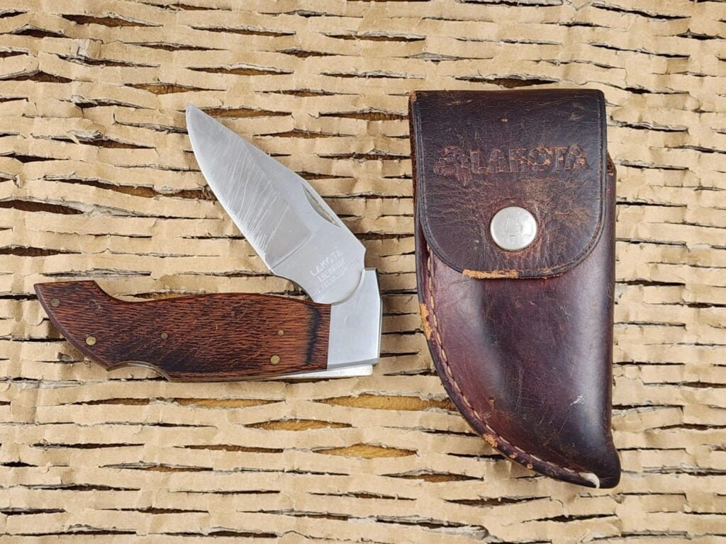 Lakota Little Hawk 271 USED This knife features original leather sheath, box, and even the papers! Lakota “Li’l Hawk” folding lockback hunting knife, made in Seki, Japan by Sei Kanematsu, probably ca. 1980s. The Lakota Li’l Hawk, and similar Lakota Hawk fixed blade knife, were designed by an avid hunter who wanted a knife that could be easily carried on the hunt, and was tough enough to field-dress big game. What makes the Lakota Hawk and Li’l Hawk knives unique is that they can be set down on a surface (such as the ground or a pickup truck bed) without the blade touching the surface, so as to avoid contaminating game while field-dressing. This knife features a stainless steel clip point blade, a blade locking device, steel bolsters, brass liners, and wood handle scales. Length closed is 4-7/8″. The blade is tang stamped Lakota Li’l Hawk US Pat. No. D248,039 on one side, and Sei F Kanematsu Seki Japan on the other side.