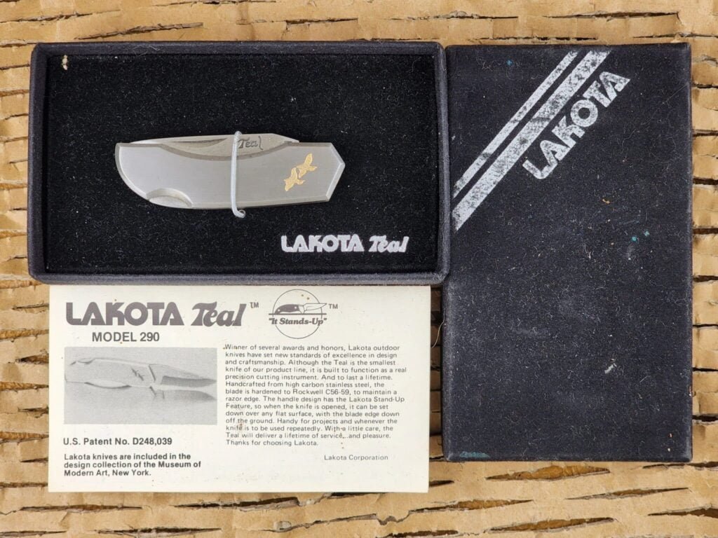 Lakota Teal in Collectors Case This is a Lakota Teal lockback. Made in the early 90’s in Seki Japan by some of Japan’s finest craftsmen. This is a patented design by Sei Kanematsu. The knife is designed to be able to stand up on edge with the blade facing down without touching the surface, handy for precision work where you constantly need to set it down and pick it back up. The blade is made of high carbon stainless steel and has not been used or resharpened and retains it’s factory edge. The handles are brushed stainless steel as well and are chip and crack free. Measures right at 2 1/2″ closed OAL.