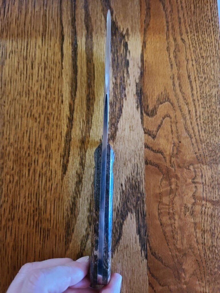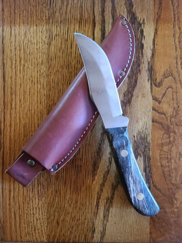Queen 4180 Brown Wood Hunter with original sheath. ****Lightly Used***8 1/4″ OAL3 5/8″ bladeWt Approx 5.2 ozHeavy duty Brown Leather belt sheath included.