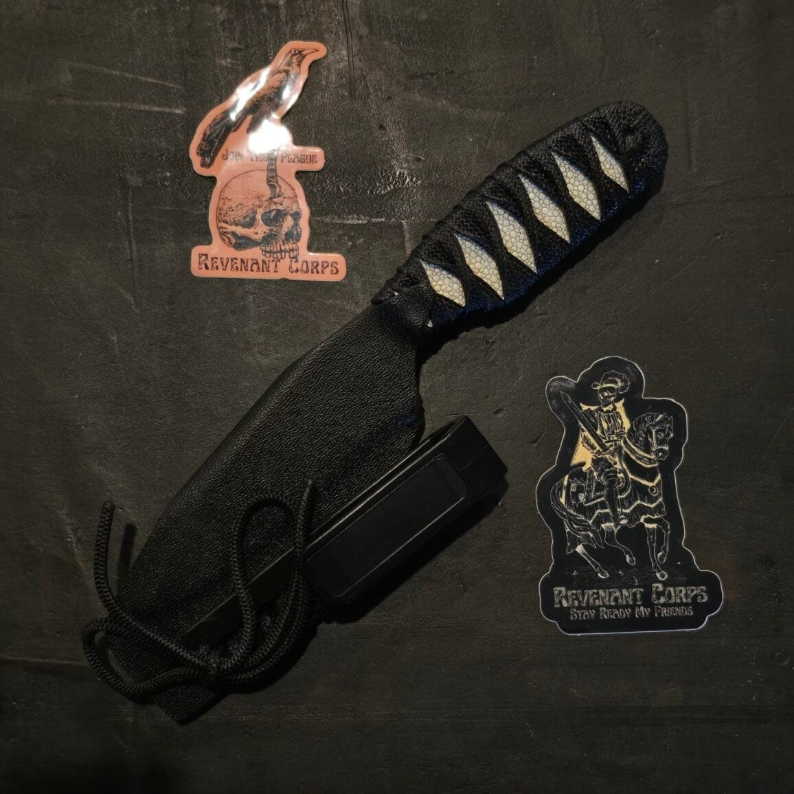 Revenant Corps G10 Drop Point Recurve DPR Black on Black w/ Belt Clip Sheath and White Stingray
