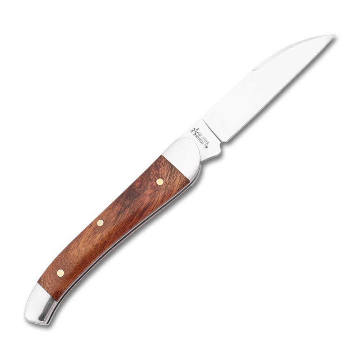3″ D2 Wharncliffe blade. Brushed satin finish. 2.7mm thick. Half stop. Slip joint. Brushed steel bolsters. Steel liners. Steel shield. Genuine Rosewood covers. 3.875″ closed. 6.8″ overall. Weighs 2.5oz. Designed by Andy Armstrong.
