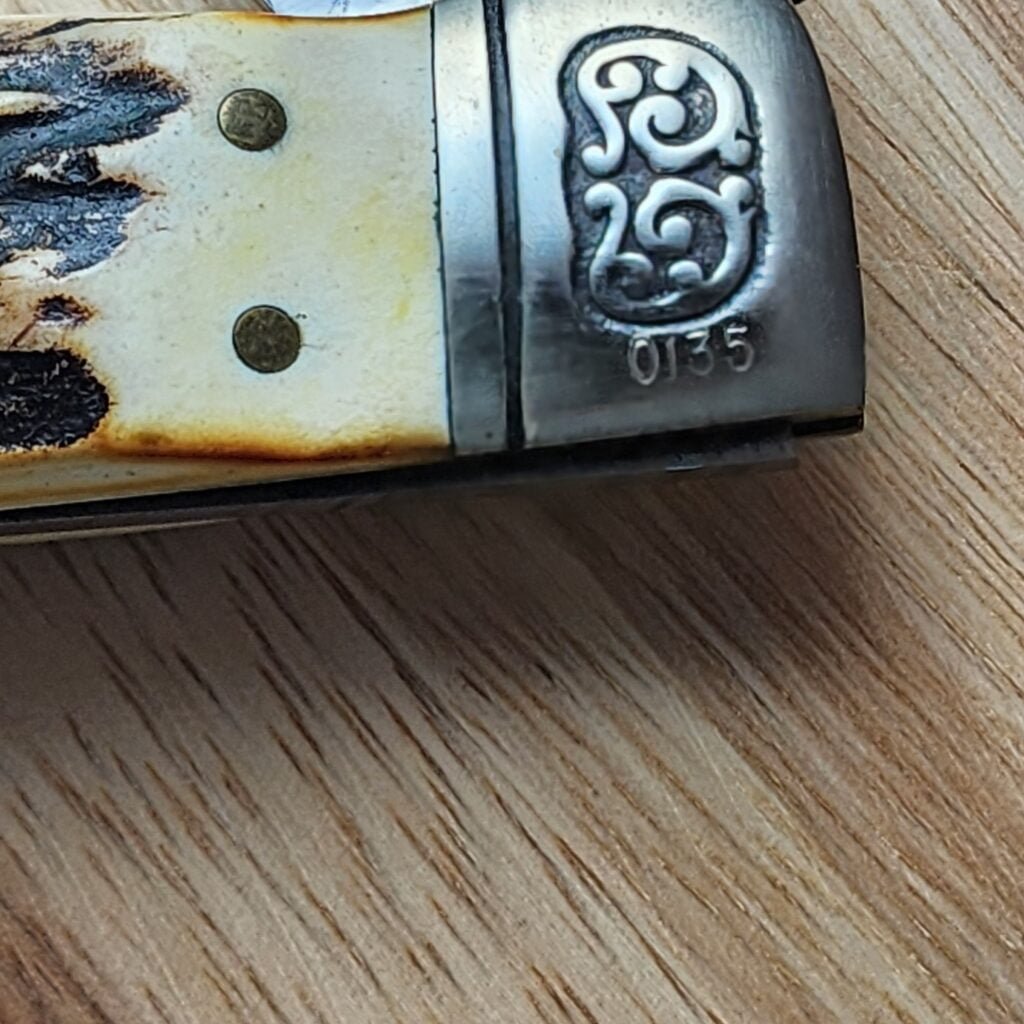 The Clip blade is stamped on the front tang with Schrade U.S.A. and pattern stamped on the rear tang with 275 and the front pocket end bolster is serial numbered with #0135