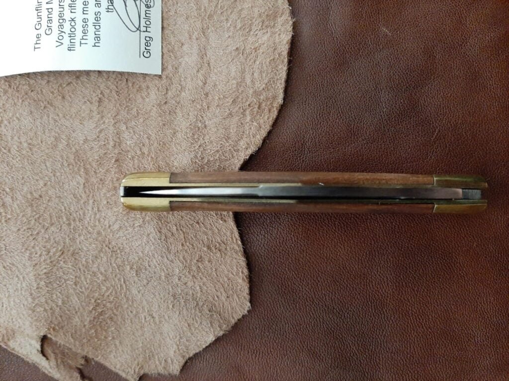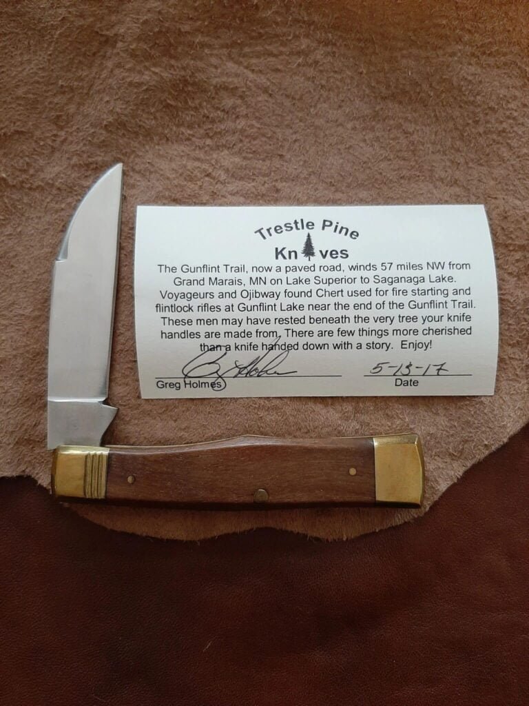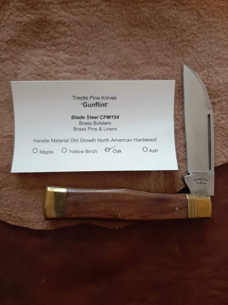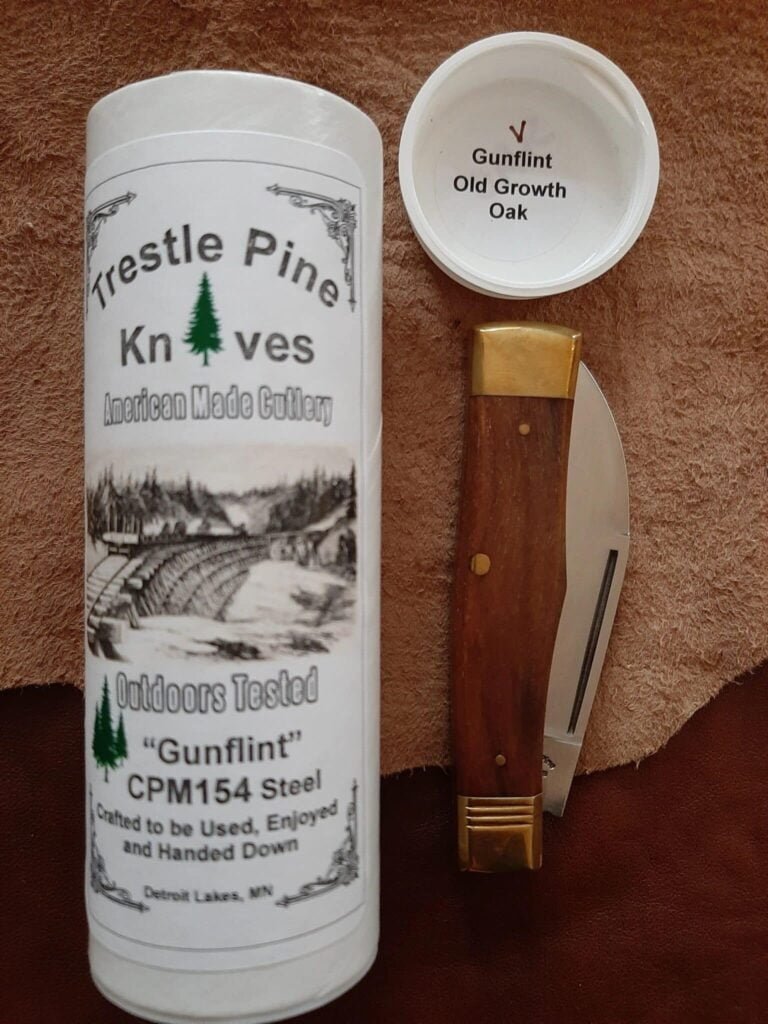 Trestle Pine Knives Gunflint ~ Old Growth Oak Handle CPM154 Wharncliffe Blade.   Long Pull Half Stop Brass Bolsters, Pins, Liners, End Cap 3.625′ OAL Closed 6.375″ OAL Open Wt Approx 2.1 oz The Old Growth Wood is a product of logs that were harvested over 100 years ago.  This particular wood came from trees that had sunk, after being harvested, in lakes and rivers of Canada and the Northern US.  Some of this wood carbon dates to the 1300’s and is highly prized by musical instrument makers and custom furniture builders for it’s tight grain and high density.  It is a very unique wood product.