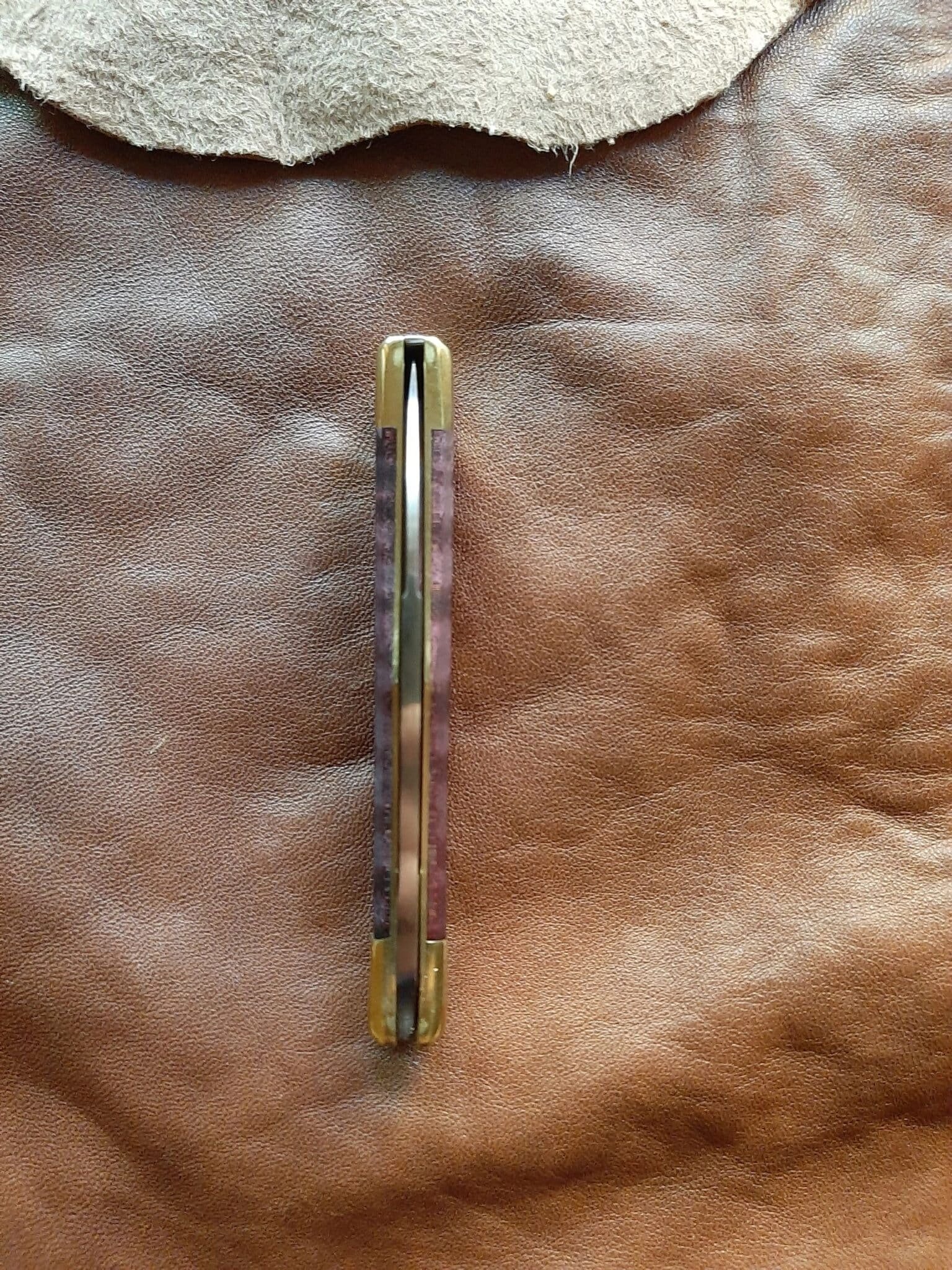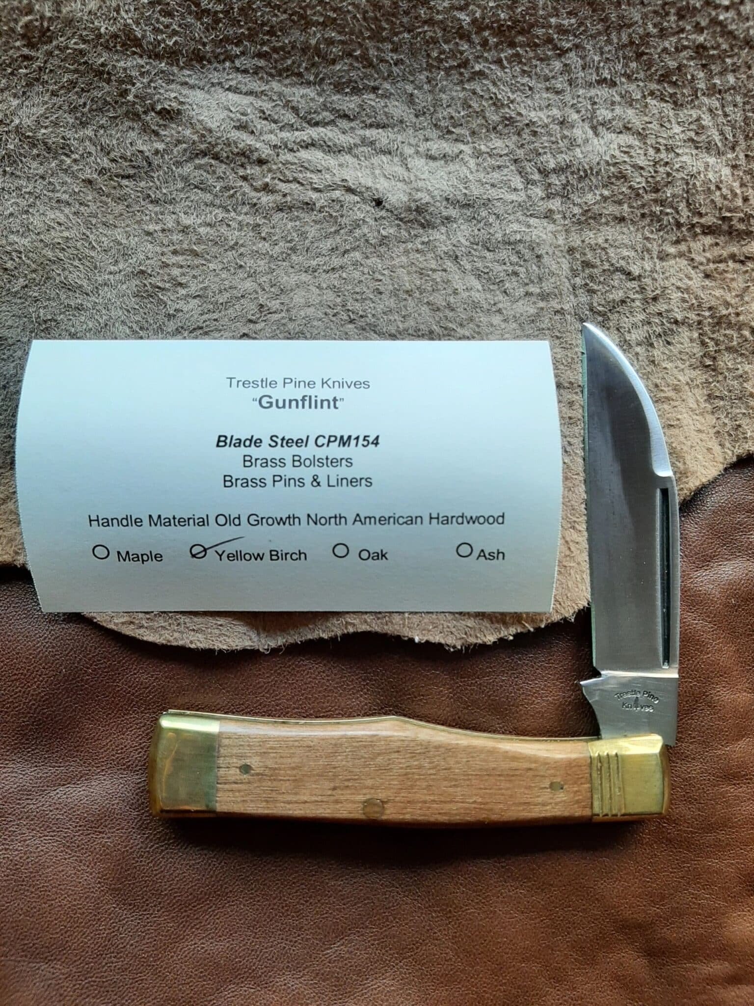 Trestle Pine Knives Gunflint ~ Old Growth Yellow Birch HandleCPM154 Wharncliffe Blade.  Long PullHalf StopBrass Bolsters, Pins, Liners, End Cap3.625′ OAL Closed6.375″ OAL OpenWt Approx 2.1 ozThe Old Growth Wood is a product of logs that were harvested over 100 years ago.  This particular wood came from trees that had sunk, after being harvested, in lakes and rivers of Canada and the Northern US.  Some of this wood carbon dates to the 1300’s and is highly prized by musical instrument makers and custom furniture builders for it’s tight grain and high density.  It is a very unique wood product.