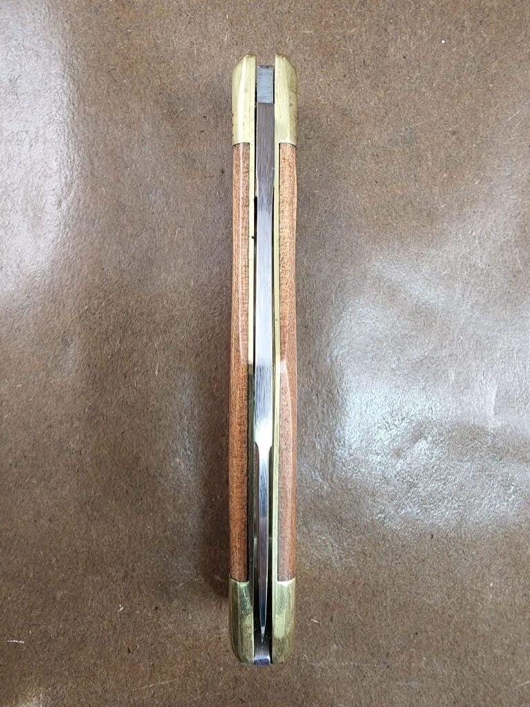 Trestle Pine Knives Gunflint ~ Old Growth Yellow Birch HandleCPM154 Wharncliffe Blade. Long PullHalf StopBrass Bolsters, Pins, Liners, End Cap3.625′ OAL Closed6.375″ OAL OpenWt Approx 2.1 ozThe Old Growth Wood is a product of logs that were harvested over 100 years ago. This particular wood came from trees that had sunk, after being harvested, in lakes and rivers of Canada and the Northern US. Some of this wood carbon dates to the 1300’s and is highly prized by musical instrument makers and custom furniture builders for it’s tight grain and high density. It is a very unique wood product.