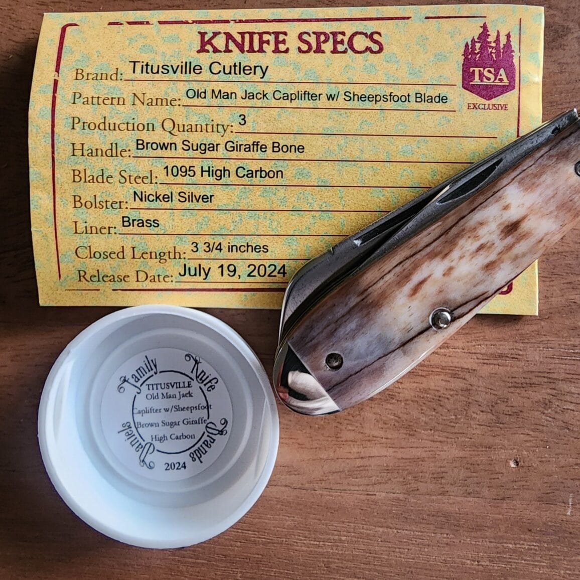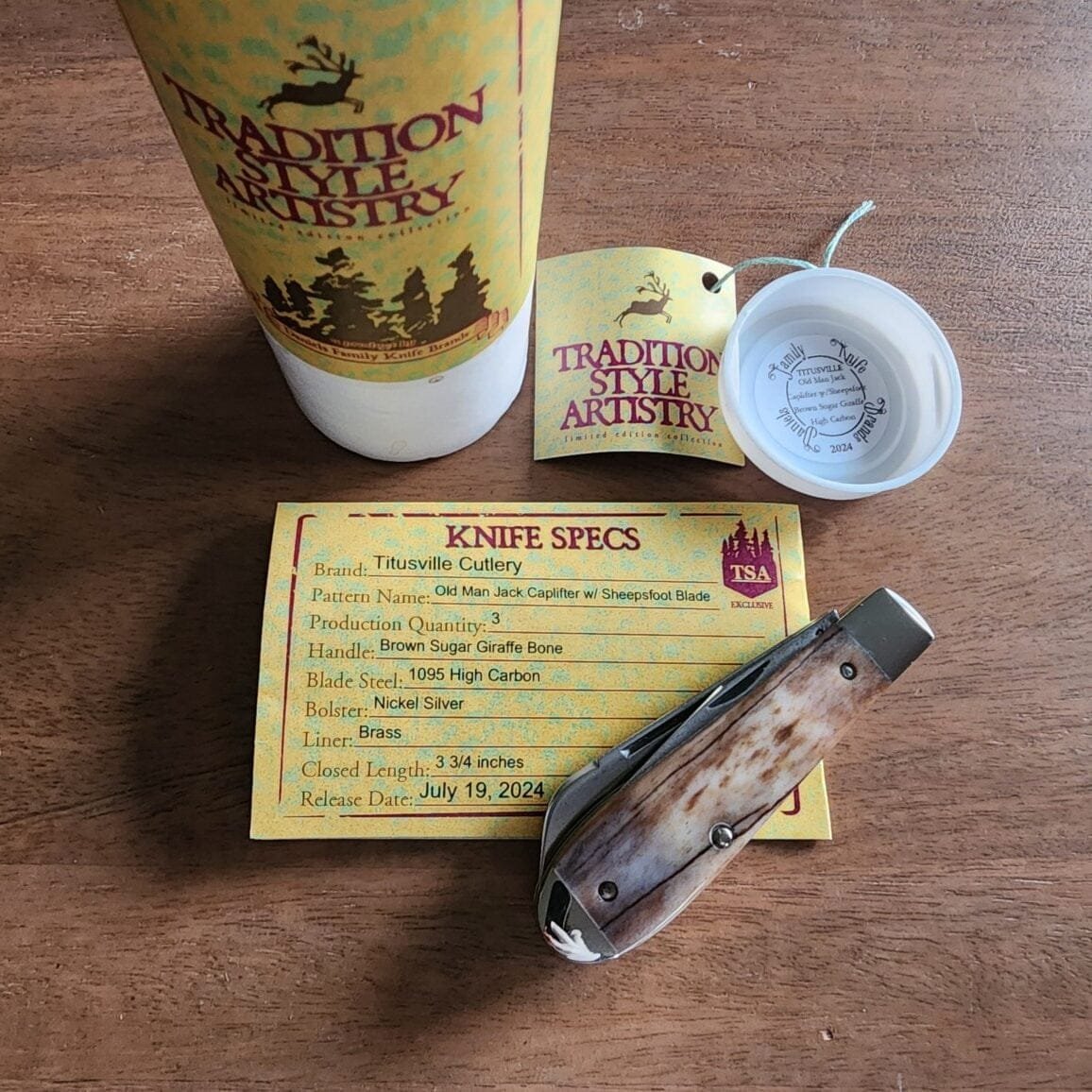 TSA Knives Exclusive Old Man Jack Caplifter w/ Sheepsfoot Brown Sugar Giraffe Bone (1 of 3) by Daniels 07/2024
