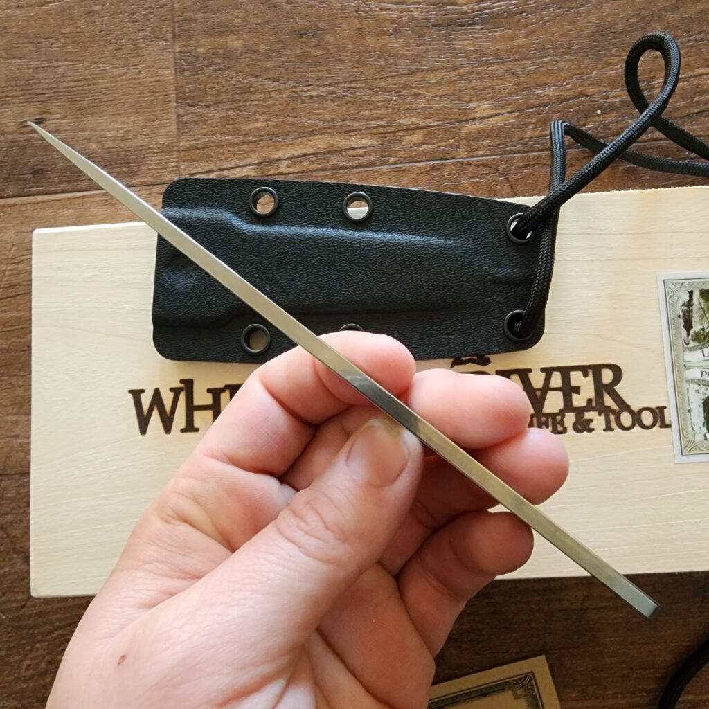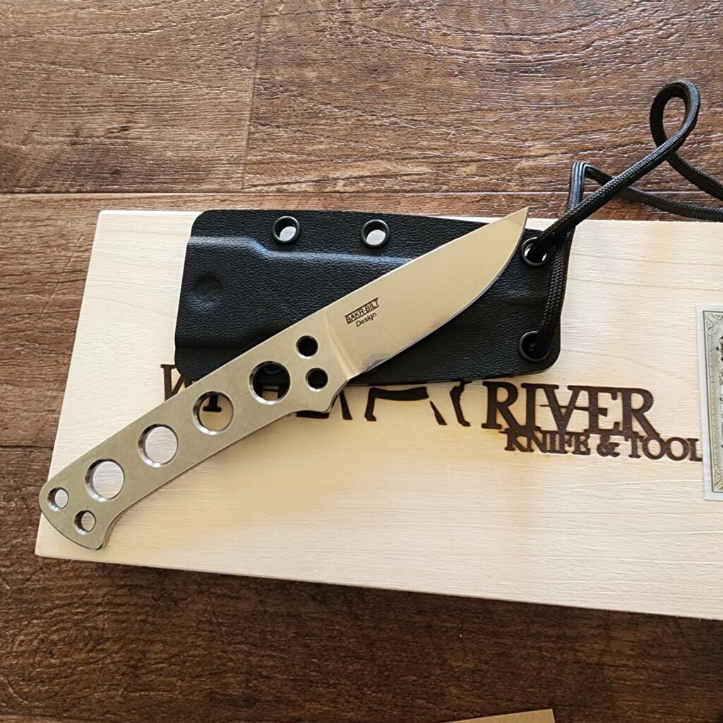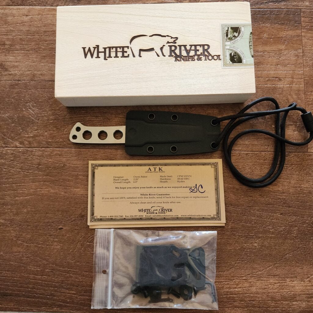 The White River ATK (Always There Knife) is designed to be just that. Always there when you need it. Small and ultra light weight at only 1.7 ounces, this knife is easy to carry. So light you will forget it is there until you need it. The Kydex sheath allows the knife to be inserted in either direction so it is easy to draw and re-sheath. Designed by custom knife maker Owen Baker Jr. (BAKR-BILT Design), the ATK is intended to be a neck-worn knife, but can also be worn on your belt with the included multi-position belt loop.